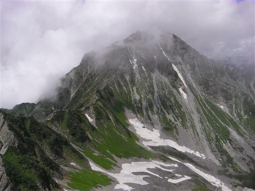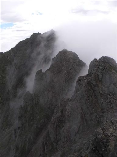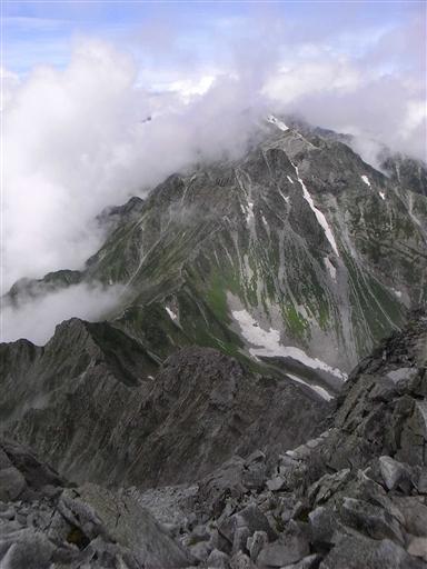 雲の中にジャンダルムが煙突のように不気味に聳えている。