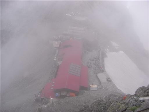 12:22 北穂高岳山頂直下に建つ小屋をかすめて縦走路に向かう。