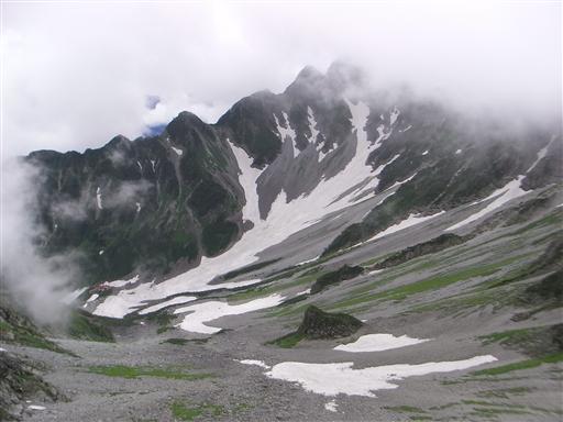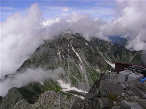 南岳小屋は視界に入っているが、その奥にあるはずの槍は見えそうで見えない。
