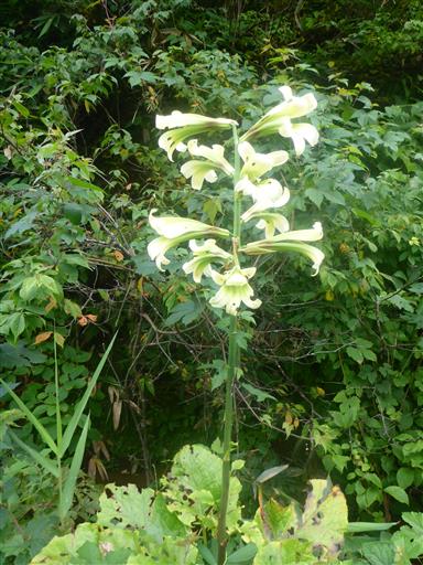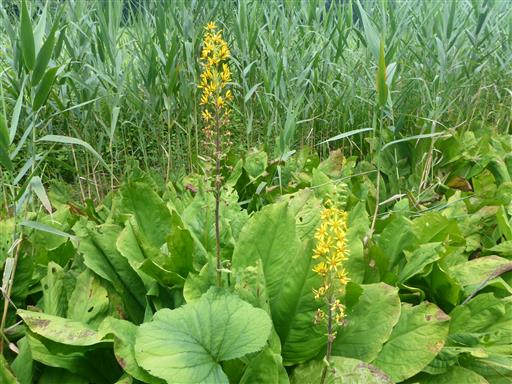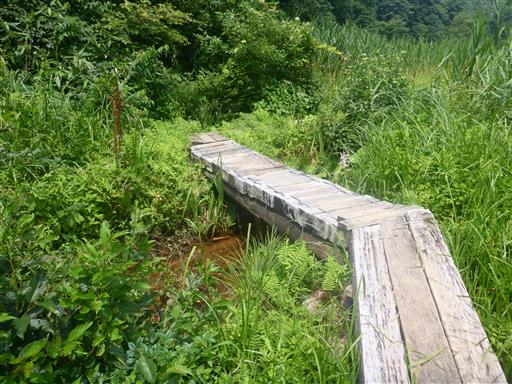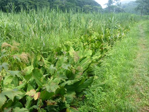 湿原に流れる川に出てくる。巨大化した水芭蕉の葉が並んでいる。