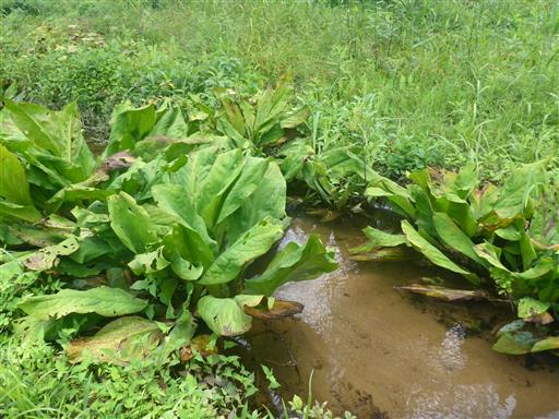 水芭蕉の葉が川を埋め尽くしている。春はきれいなのだろう。