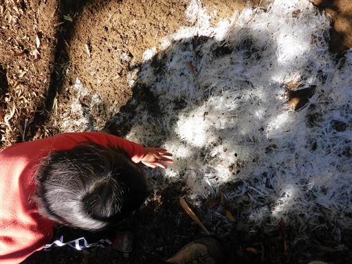 長い霜柱が散らばっている。斜面から落ちてきたのだろうか?