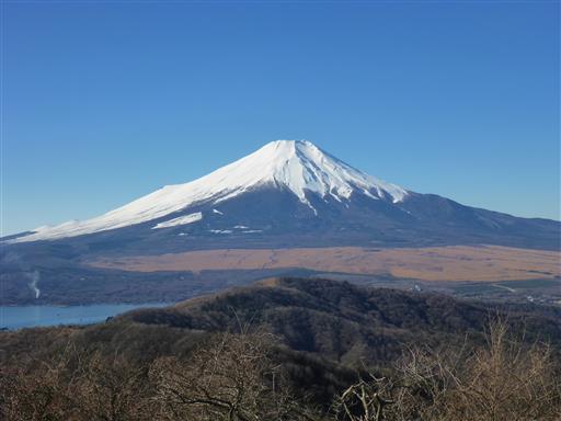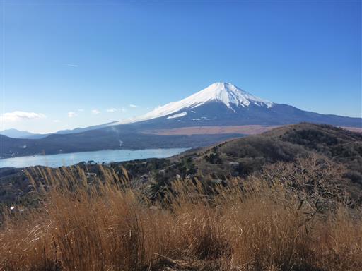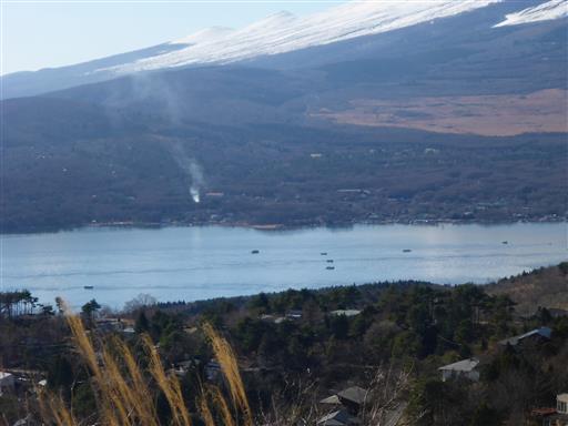眼下に見えるのは山中湖。船が浮かんでいるのが小さく見える。