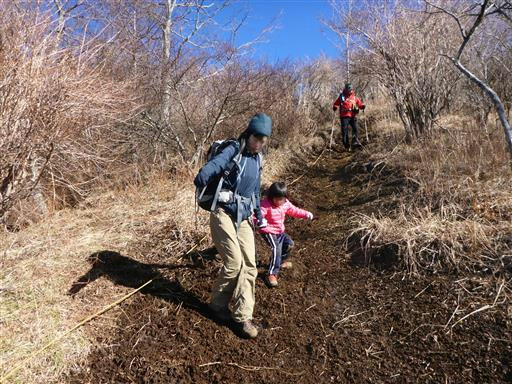 昼になって霜柱が解けてきたため、泥だらけで滑りやすい。