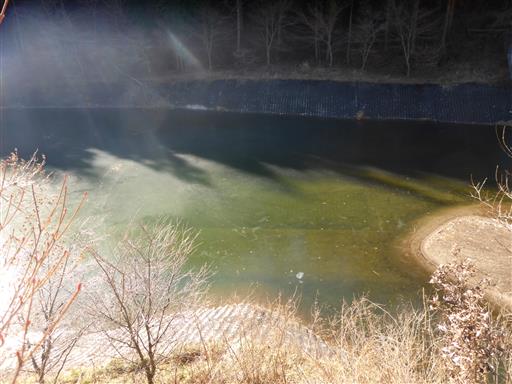 最後は僅かな車道歩きだ。右手に見えるダム湖は完全に凍りついている。