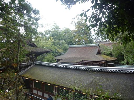 楼門、拝殿の裏に本殿の屋根が見えている。