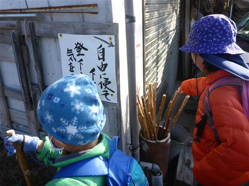 登山口近くに杖が置かれている。