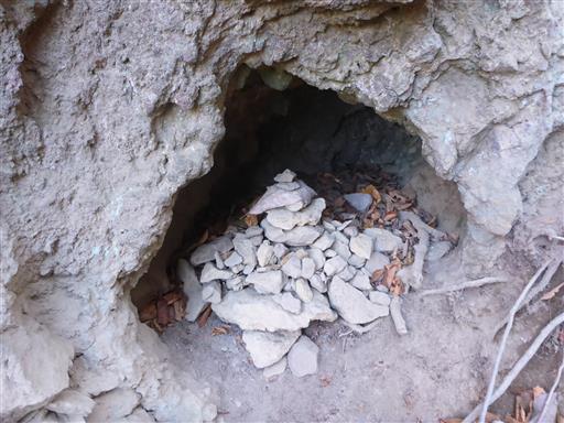 岩穴の中に石が積まれている。