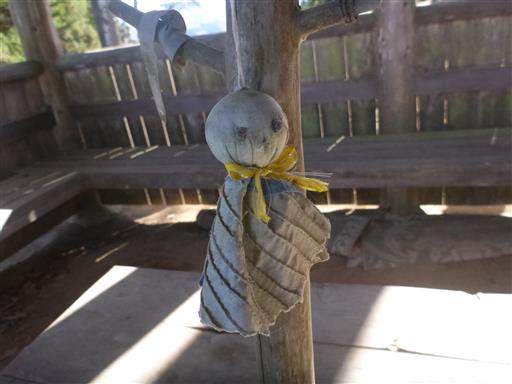 東屋のなかにてるてる坊主が掛かっている。
