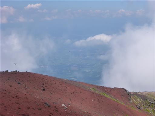 雲が切れて、下界の田園風景が少しだけ見える。