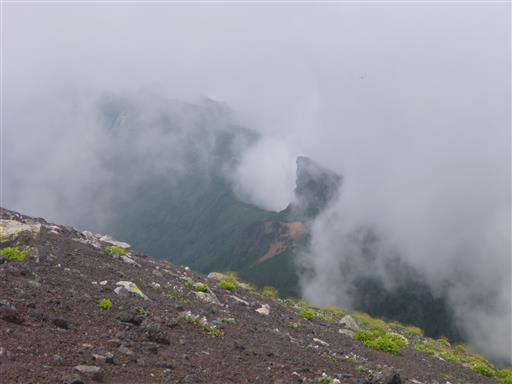 雲の隙間からガレ場が見えるが、すっきりとは見通せない。