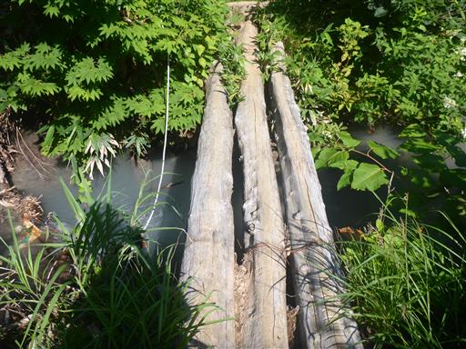 白く濁った川を丸太橋で渡る。