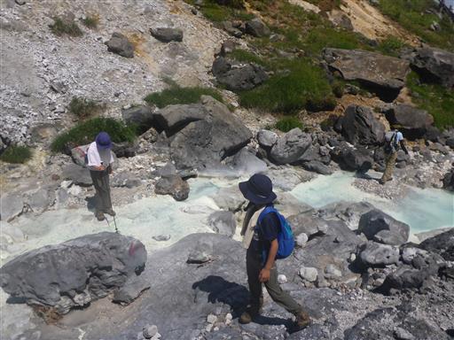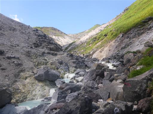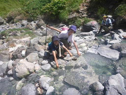 沢沿いに下りてくる。手を浸けて見てびっくり、熱いお湯が流れている。