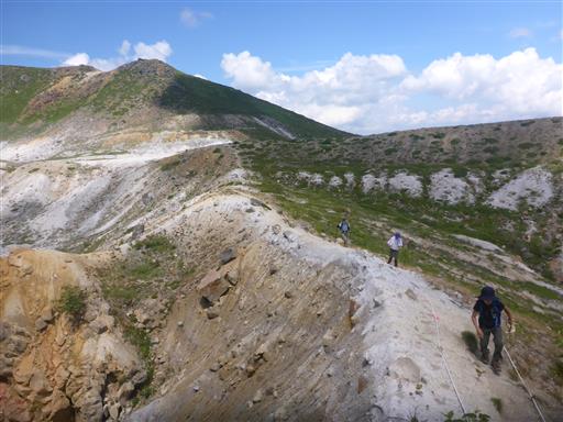 ここから火口縁を歩く。滑り落ちそうで一見怖い道だ。