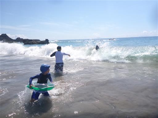 波乗りをして遊ぶ。娘は波に吹っ飛ばされてから、主に砂浜で遊び始める。