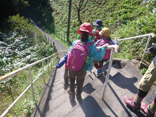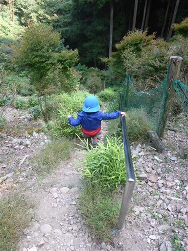 息子に「カニさん歩きで下るんだよ」と教えてあげると、手もカニさんになっている。