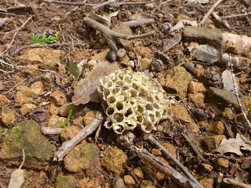 地面にハチの巣が落ちている。幸いハチはもういない。