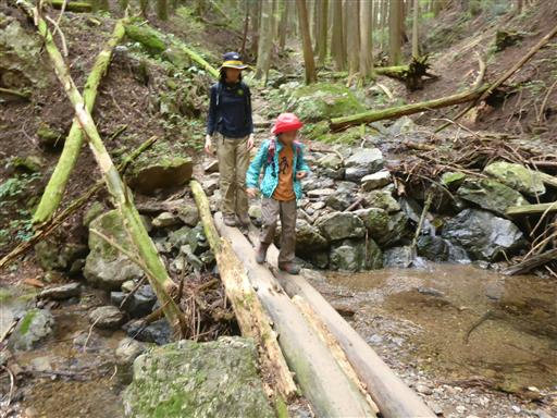 慎重に木橋を渡る。息子は怖いらしく手をつないで通過する。