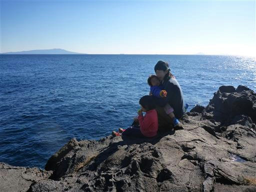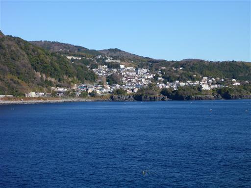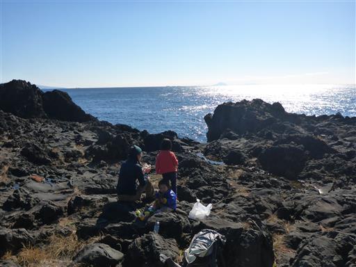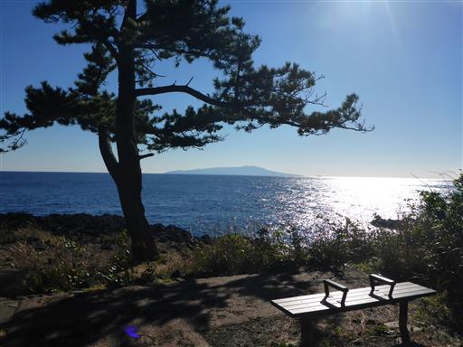 休憩場所。奥に見えるのは伊豆大島。意外に近い場所にある。