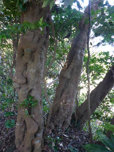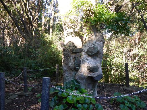 石喰いのモチノキ。石を呑みこんで木が生長したため、木の幹に幾つも石がめり込んでいる。