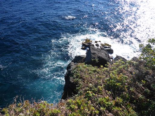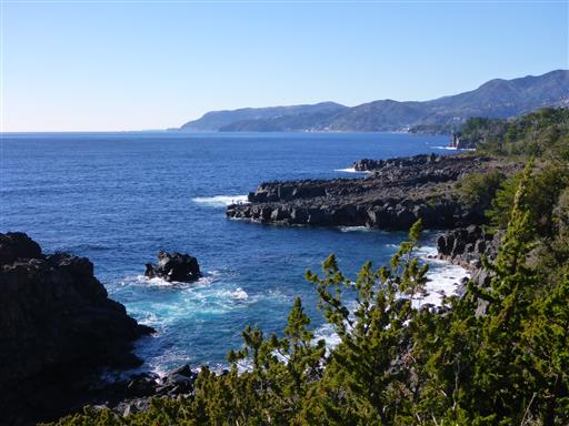流れ出た溶岩が海に張り出した部分が所々に見られる。