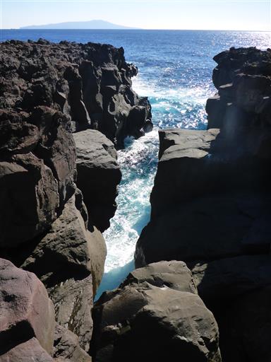 穴口。深い岩の穴から海が覗ける。