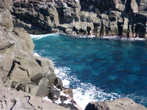 海の中に黒い溶岩が横たわっている。