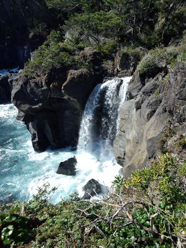 対島の滝。海に直接落ちる珍しい滝だ。