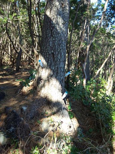 松の木に栄養剤が何本も突き刺さっている。