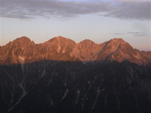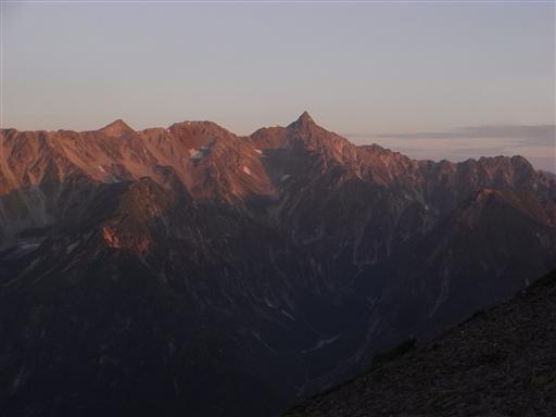 槍ヶ岳もモルゲンロートに染まっている。