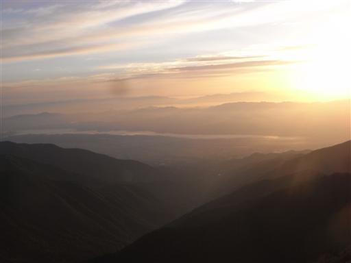 眼下には朝もやに霞む安曇野の町が見える。
