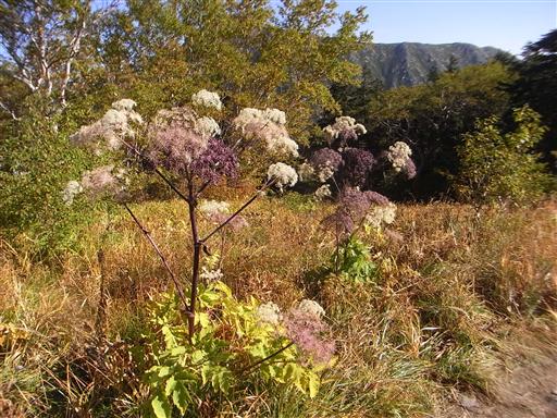 小ピークに到着。枯れかかったオオカサモチが寂しく立っている。