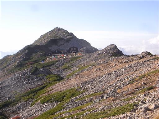 足下の常念乗越には常念小屋が見えている。