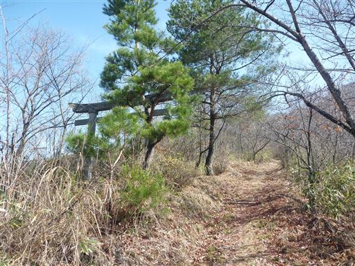 緩い傾斜の尾根を登っていく。なぜか登山道とずれたところに鳥居が立っている。