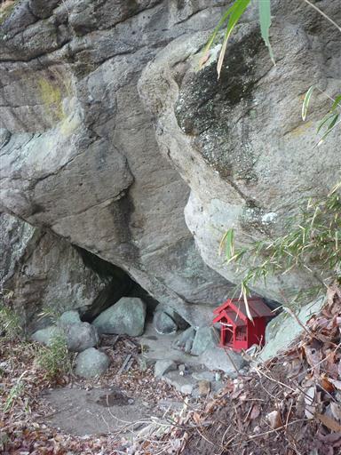 大きな岩の下に小さな祠がある。
