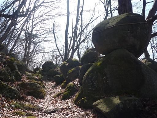 車道の終点から神社の参道を登っていく。辺りには丸い巨岩が転がっている。