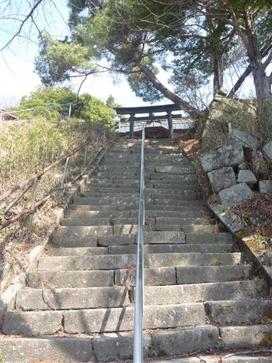 河内神社前に到着。古びて歪んだ石段を登る。