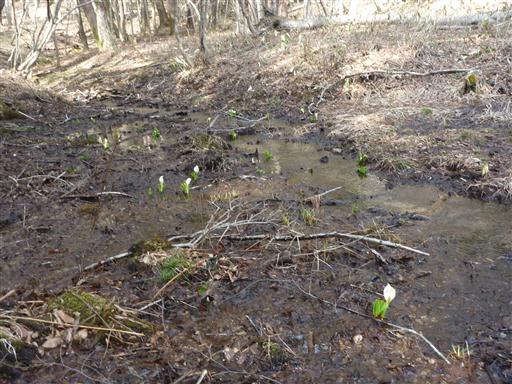 三峰沼近くにミズバショウが咲いている。まだ咲き始めでどの花も小さい。