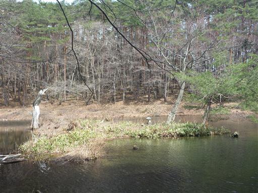 沼の中に小島があり、どうやって渡ったのか、小さな祠が祀られている。