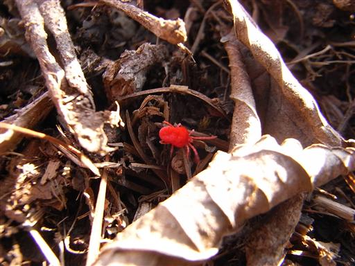 足元に赤くてきれいな虫を発見。足が8本あるのでクモだろうか?