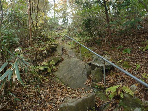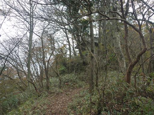 山頂部は岩がちな地形が続く。岩場というほどではないが急傾斜の道だ。