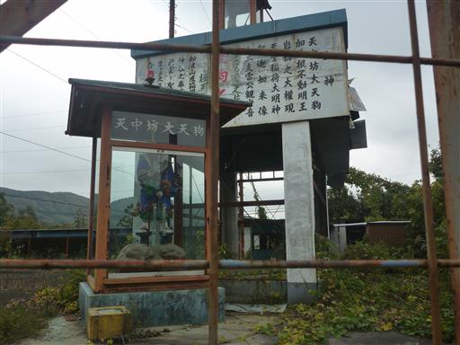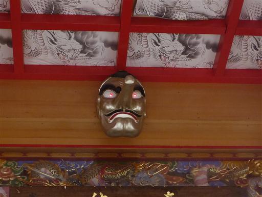 まずは神社にお参り。天狗の面の目が光っている。ちょっと不気味な神社だ。