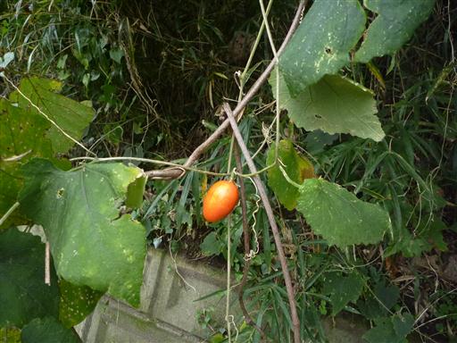 道端にカラスウリの実がなっている。娘は最近実に凝っているので興味津々だ。