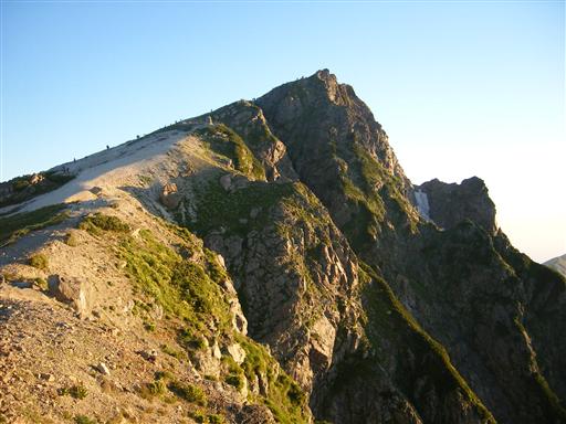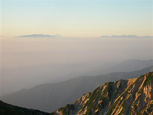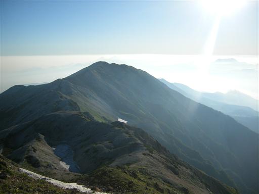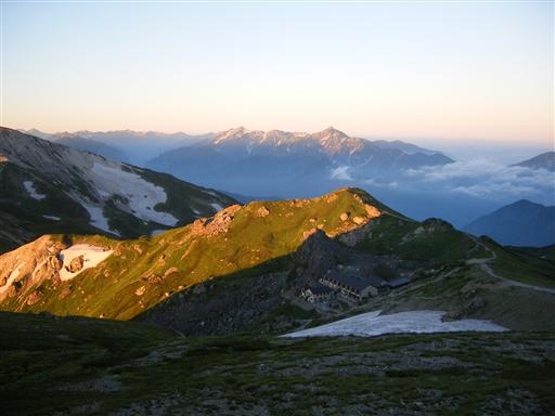 昨日歩いた杓子岳と白馬鑓ヶ岳が赤く染まっている。