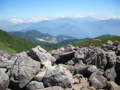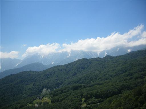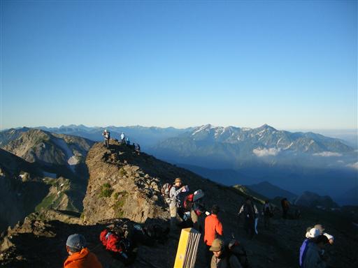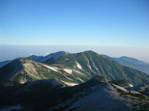 山頂からは立山、剱岳の他、遠くには槍や穂高まで見える。