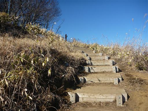 山頂直下は少し傾斜のきつい階段が続く。本日は快晴だ。