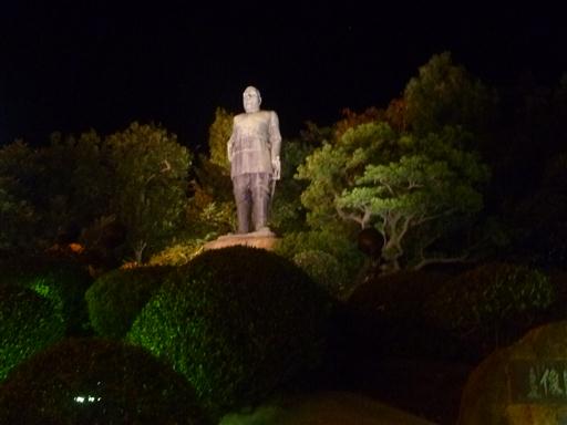 西郷隆盛像。暗闇の中に浮かぶ姿は少々不気味だ。
