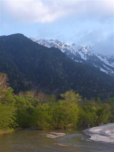 穂高岳の反対側には、美しい梓川の向こうに焼岳の姿が見えている。