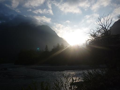 5:30 谷筋の上高地で日の出を迎える。