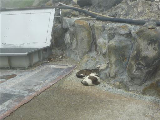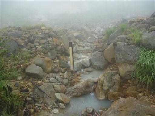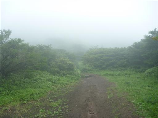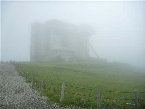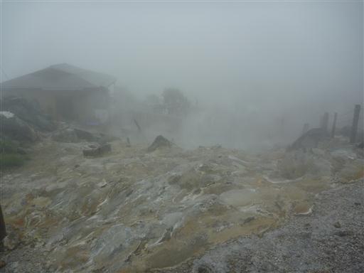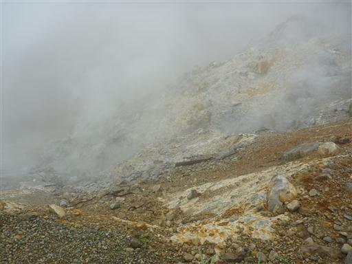 視界はほとんどないが、微かに立ち上る噴煙が見える。